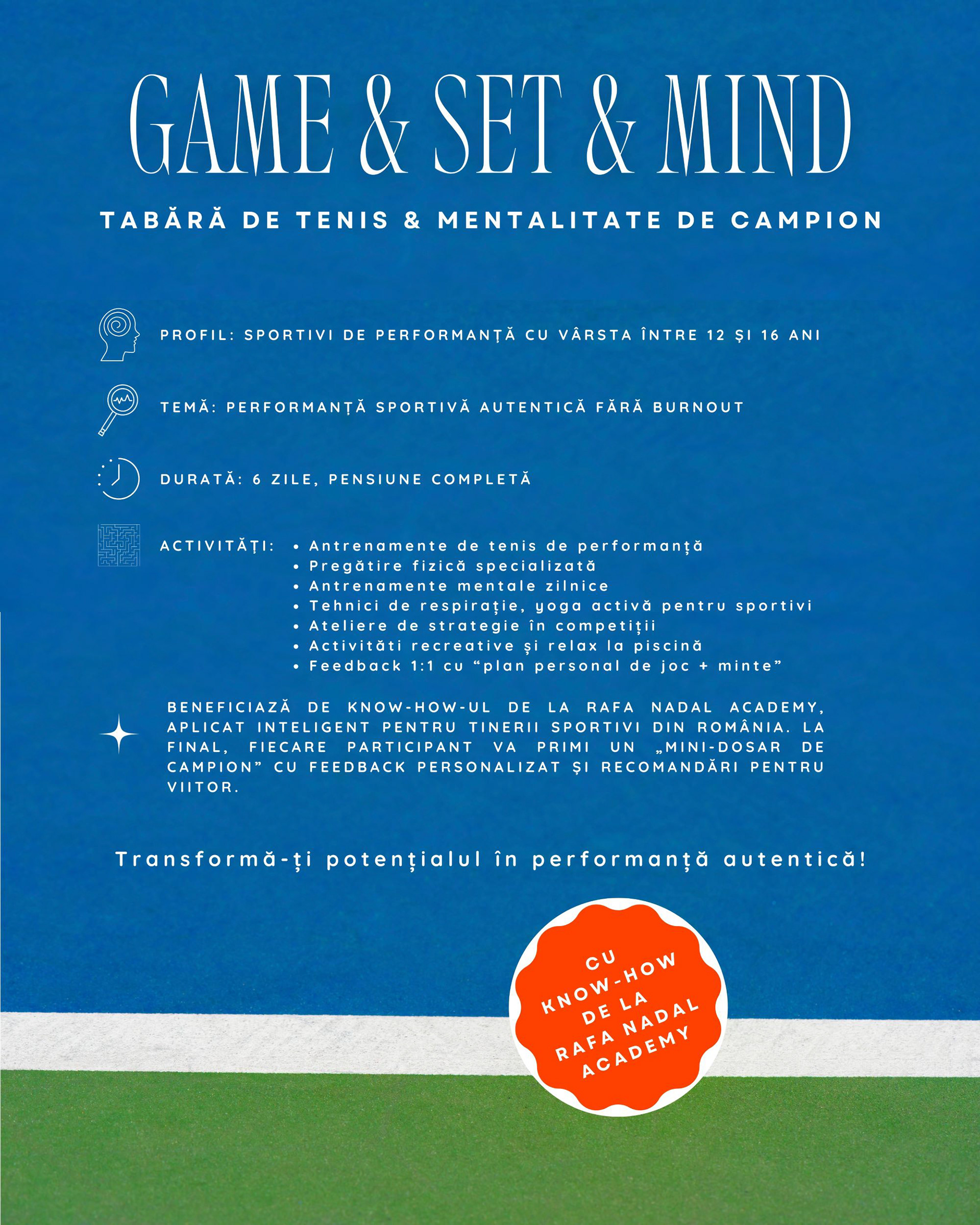 Game & Set & Mind este tabăra de performanță în tenis dedicată juniorilor cu vârste între 12–16 ani.